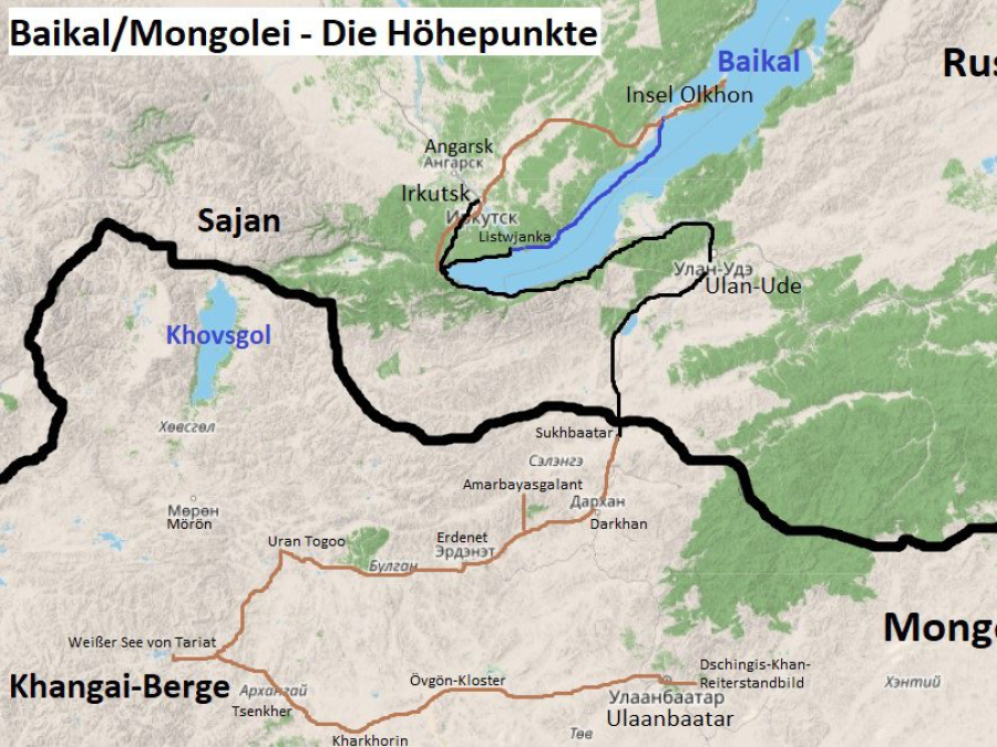 Holzbauviertel Kvartal 130 in Irkutsk - Krugobaikalskaya (Baikalrundbahn) - Angara-Quelle mit Schamanenstein - Freilichtmuseum Talcy - Aussicht vom Cersky-Berg - Schnellboot auf dem Baikal - Schamanenfelsen von Khuzhir - das spektakuläre Nordende Olkhons - Angara-Eisbrecher in Irkutsk - Transsibirische bzw. Transmongolische Eisenbahn von Irkutsk nach Sukhbaatar - Saikhany Khotol-Felsplateau - Kloster Amarbayasgalant - Uran Togoo-Vulkanfeld - Weißer See von Tariat - Tsenkher Thermalquelle - Erdene Zuu Kloster, Kloster Uvgun - Dschingis Khan Reiterstandbild - Gandan-Kloster - Ulaanbaatar